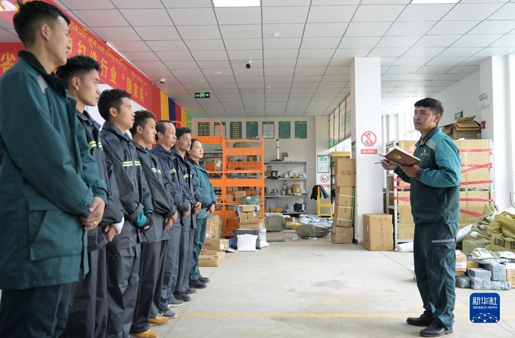 哈弄奪機(右一)在縣郵政快遞物流倉配中心主持出班前的晨會(huì ),向投遞員們安排任務(wù)(6月16日攝)。