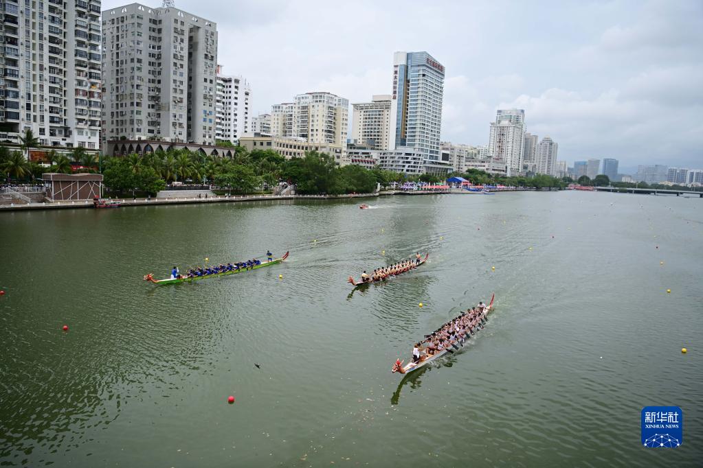 6月18日,龍舟隊在海南省三亞市三亞河上進(jìn)行比賽。