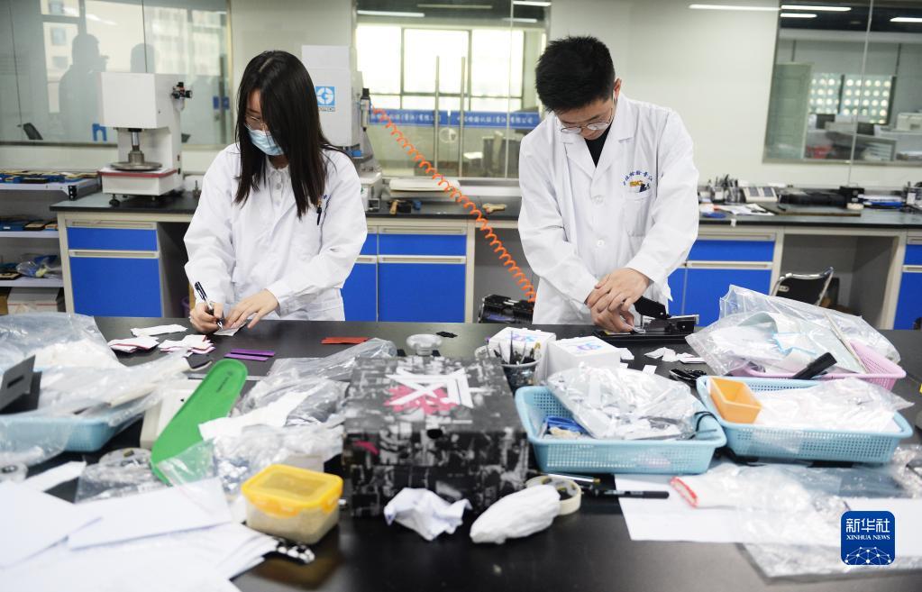 6月18日,中國皮革和制鞋工業(yè)研究院(晉江)有限公司科研人員在實(shí)驗室制樣。