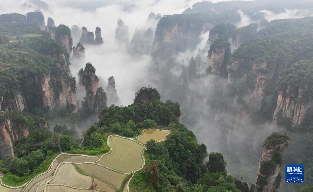 近日,湖南張家界迎來(lái)連續降雨。雨后,云霧在連綿聳立的峰林間飄蕩,懸崖峭壁之上的農田在云霧中若隱若現,構成一幅幅獨特的生態(tài)畫(huà)卷。