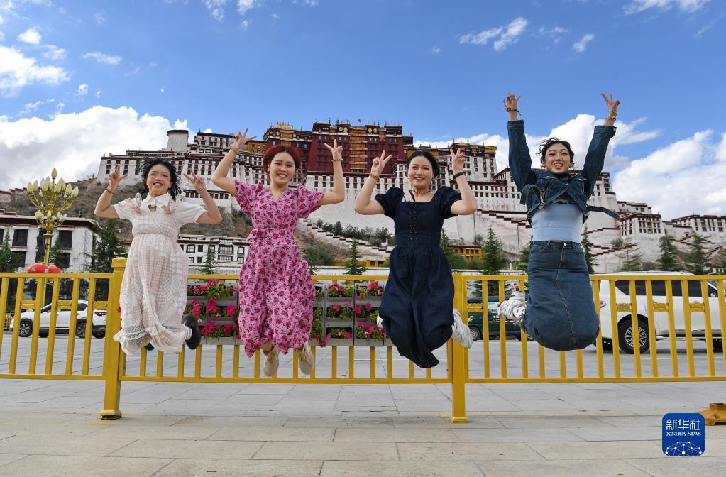 游客在布達拉宮廣場(chǎng)上合影留念(6月16日攝)。