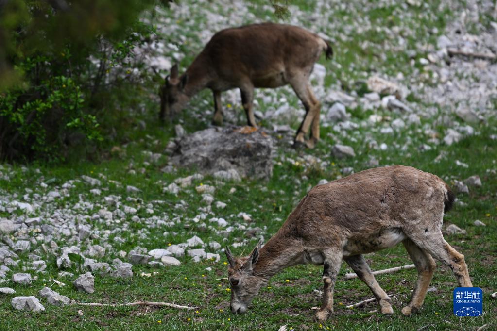 這是6月18日在青海省玉樹(shù)藏族自治州囊謙縣境內拍攝的覓食的巖羊。