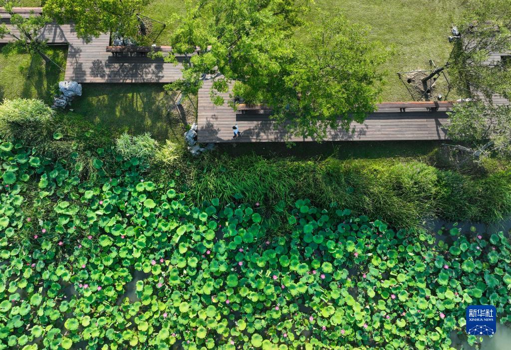 市民在揚州運河三灣風(fēng)景區晨練(6月15日攝,無(wú)人機照片)。
