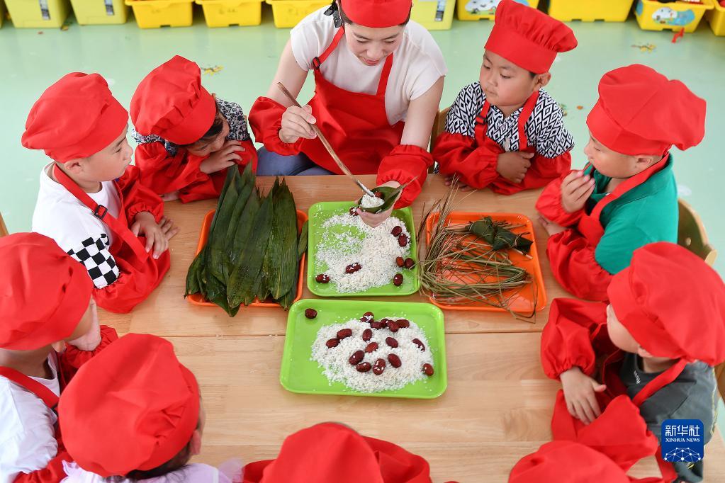 6月19日,山東省煙臺市福山區清洋街道中心幼兒園的小朋友在老師指導下學(xué)習包粽子。