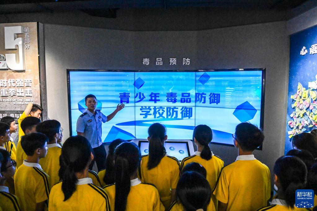 6月19日,在廣西禁毒教育示范基地,民警為學(xué)生們講解禁毒知識。