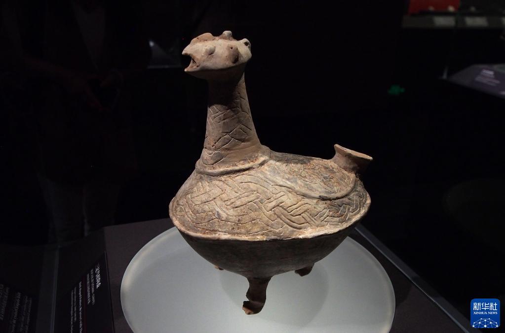 6月19日在特展上拍攝的浙江海鹽西塘橋采集的三足鳥(niǎo)形陶盉。