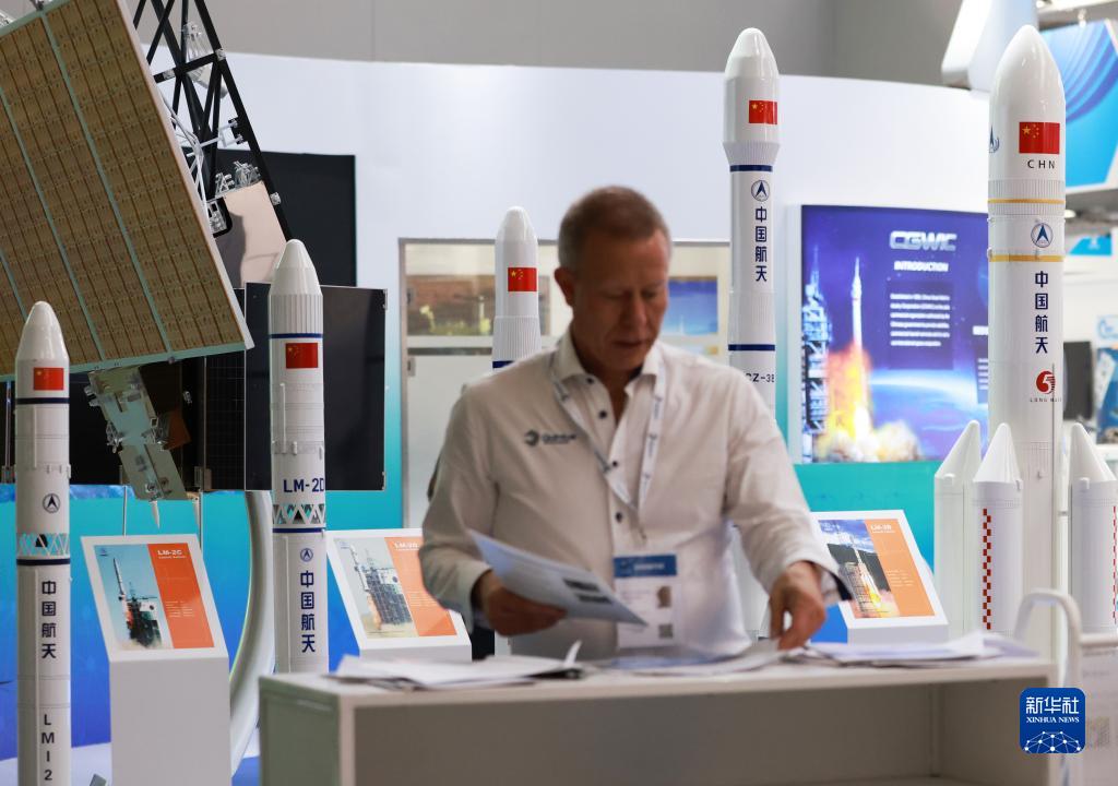 6月19日,在法國巴黎近郊的布爾歇機場(chǎng)舉行的巴黎航展上,一名男子參觀(guān)中國航天科技集團有限公司的展臺。