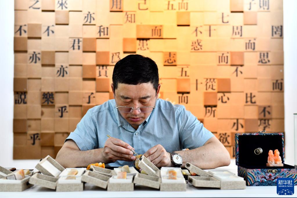 在曲阜市尼山腳下的魯源新村文化街區,孔府印閣的工作人員在制作印章(2023年6月8日攝)。