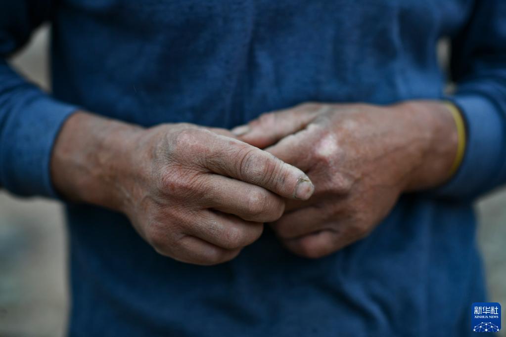 這是在營(yíng)地拍攝的東方物探公司塔里木物探處2170隊司鉆李事全的雙手(6月18日攝)。鉆井機運轉期間,李事全作為司鉆,須寸步不離守護、操作設備。新華社記者 胡虎虎 攝