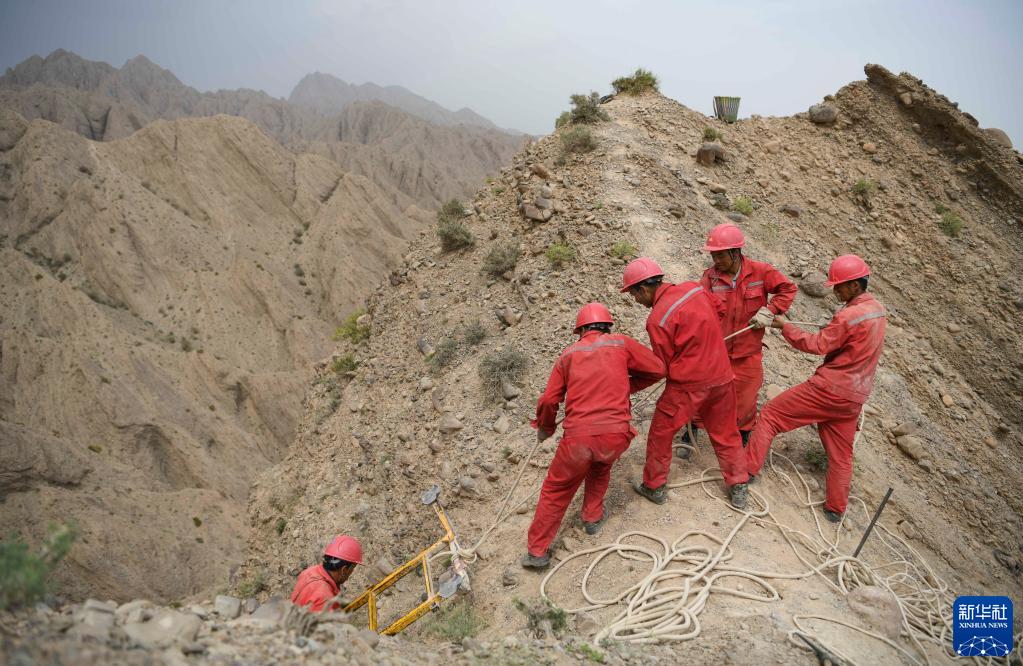 東方物探公司塔里木物探處2170隊的鉆工們合力將鉆井設備從山谷運送到崖壁之上(6月18日攝)。新華社記者 胡虎虎 攝