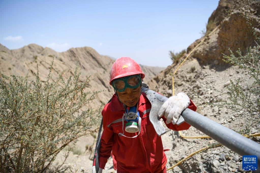 東方物探公司塔里木物探處2170隊鉆井組的司鉆李事全扛著(zhù)設備前往鉆井點(diǎn)位(6月18日攝)。新華社記者 胡虎虎 攝