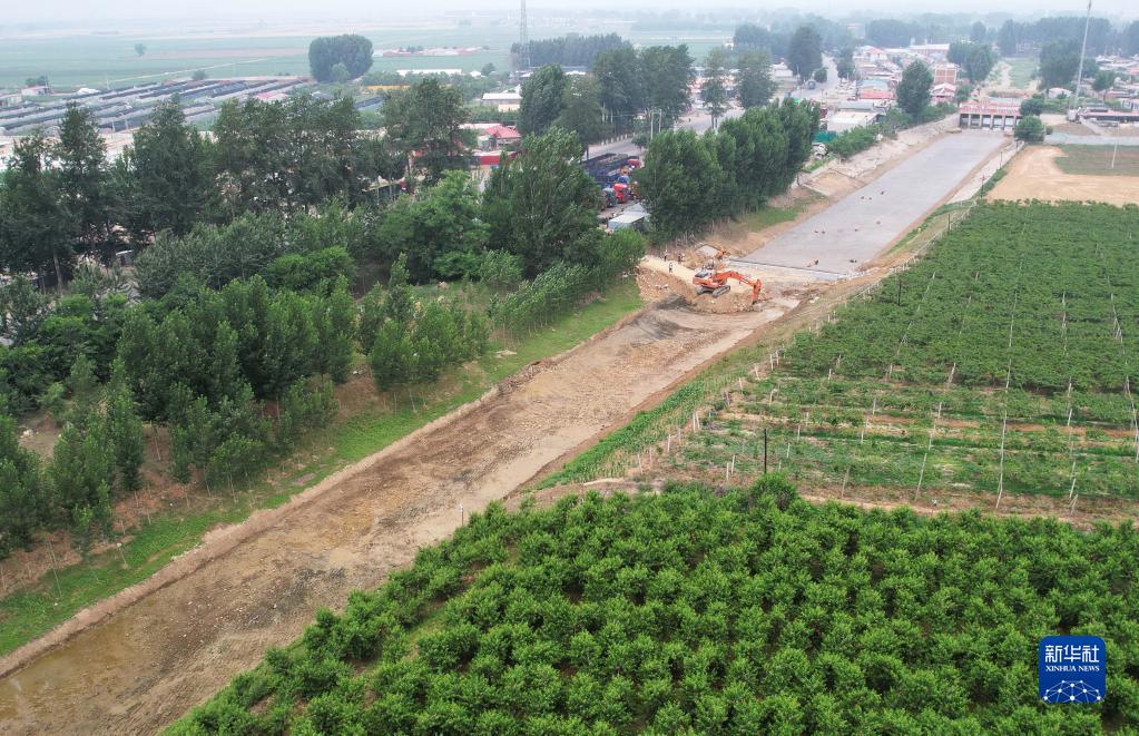 6月20日,工人在河北省盧龍縣木井鎮境內的龍鳳河水生態(tài)治理工程工地施工(無(wú)人機照片)。