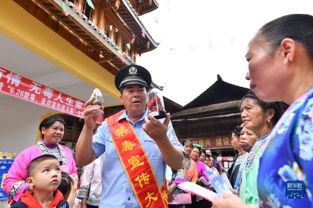 在第36個(gè)國際禁毒日來(lái)臨之際,廣西柳州市融水苗族自治縣桿洞鄉烏英苗寨開(kāi)展禁毒知識進(jìn)苗寨宣傳教育活動(dòng),通過(guò)講解禁毒知識、鑒別毒品樣品、發(fā)放宣傳資料等方式,幫助村民提高識別毒品能力,增強禁毒意識。