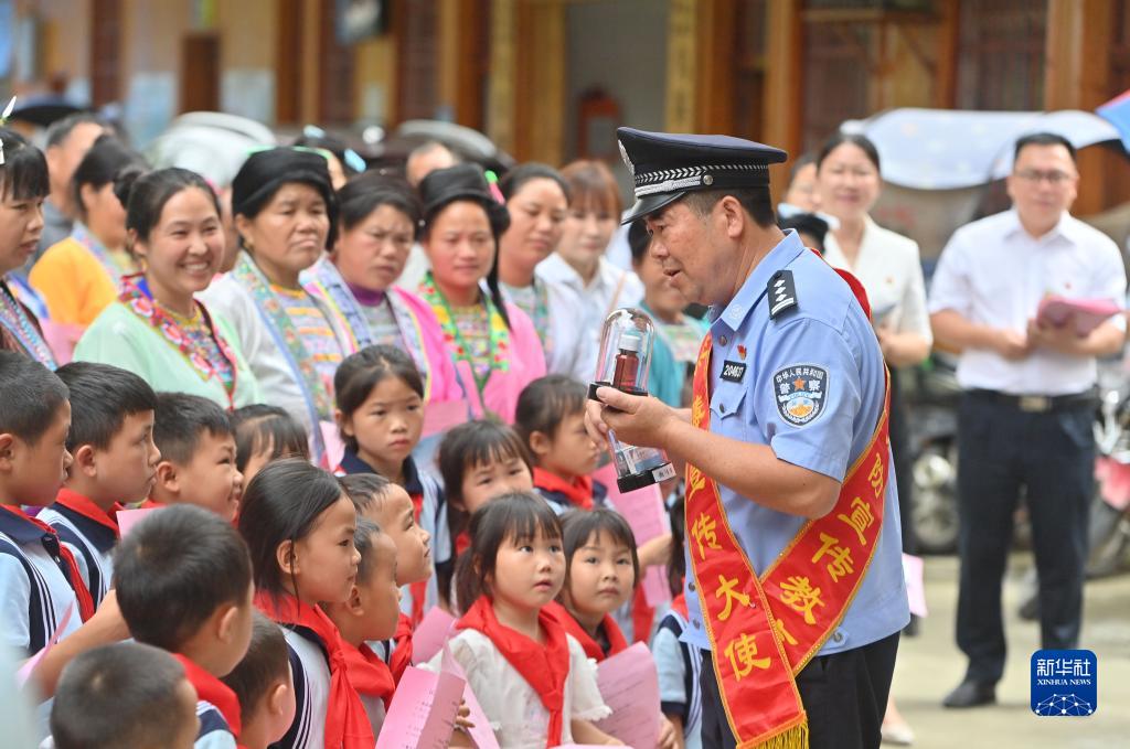 6月20日,在廣西融水苗族自治縣桿洞鄉烏英苗寨,民警介紹禁毒知識。