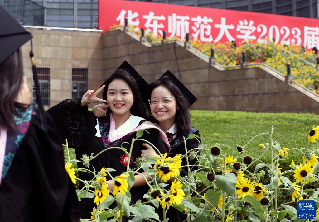 6月20日,在華東師范大學(xué)2023屆畢業(yè)典禮前,畢業(yè)生們在向日葵前合影。向日葵是由畢業(yè)生票選、學(xué)校專(zhuān)門(mén)種植的“畢業(yè)花”。