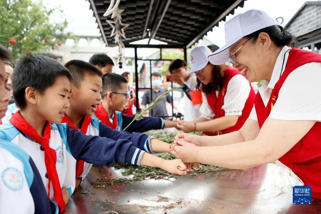 6月20日,山東省青島市即墨區的志愿者為即墨區第一實(shí)驗小學(xué)的學(xué)生佩戴五彩線(xiàn)。