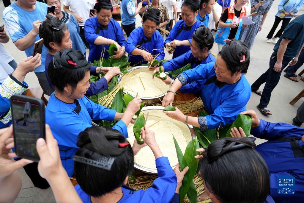 6月20日,在貴州省榕江縣新市民活動(dòng)中心,居民參加包粽子比賽。