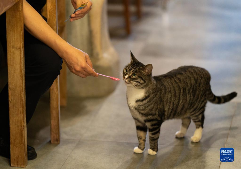 一名顧客給貓咪“故知”喂食(6月19日攝)。