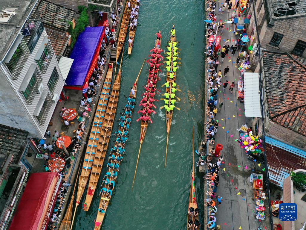 福州市長(cháng)樂(lè )區三溪村,龍舟在穿村而過(guò)的小溪中競渡迎端午(6月18日攝,無(wú)人機照片)。