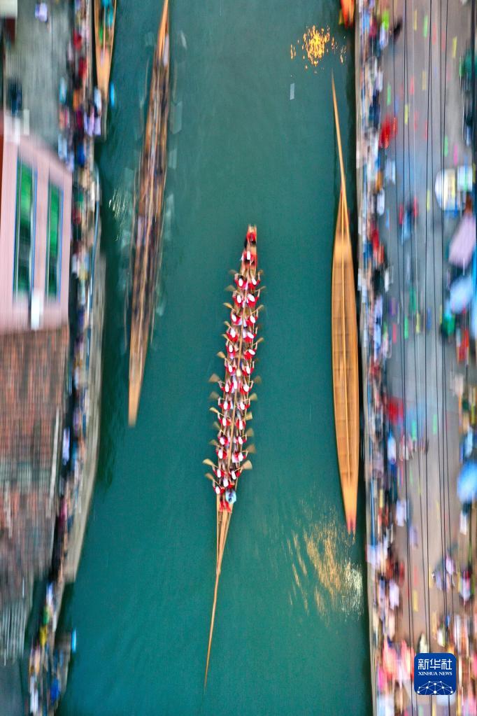 福州市長(cháng)樂(lè )區三溪村,龍舟在穿村而過(guò)的小溪中競渡迎端午(6月18日攝,無(wú)人機照片)。