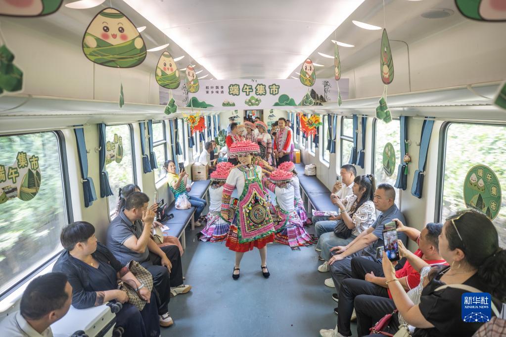 端午小長(cháng)假來(lái)臨之際,一輛載著(zhù)300余名旅客的5630次列車(chē)從遵義站緩緩駛出,前往重慶西站。與之前搭乘的“慢火車(chē)”不同的是,旅客乘坐該趟列車(chē),不僅可欣賞沿途各地的風(fēng)景,還能在列車(chē)上逛“集市”、看節目、包粽子,在旅途中體驗別樣的端午民俗。