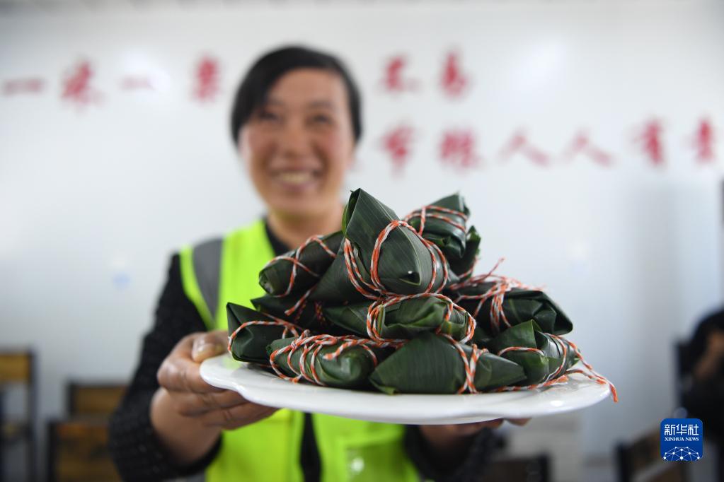 6月21日,中建三局一名工人展示工友們包的粽子。