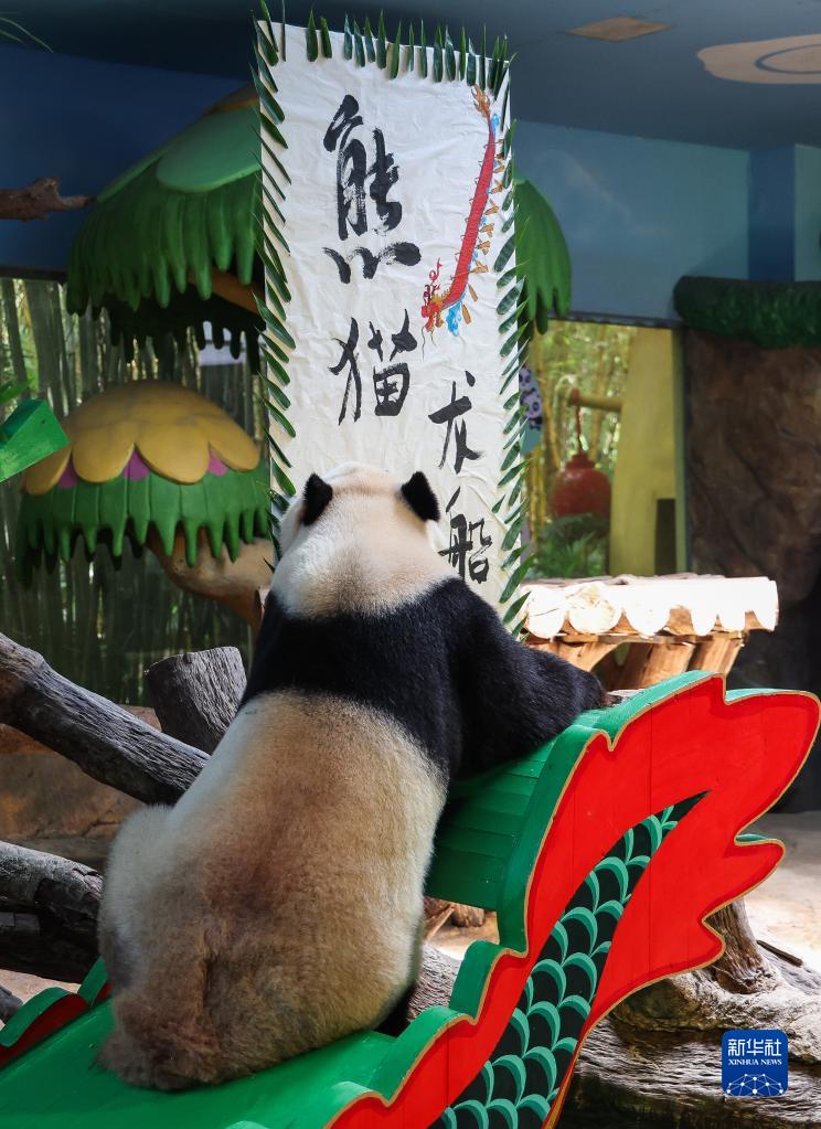 當日,廣州長(cháng)隆野生動(dòng)物世界熊貓館的10余只大熊貓迎來(lái)一個(gè)特別的端午節,它們與游客一起渡龍船、吃粽子,“體驗”一把端午文化的氛圍。