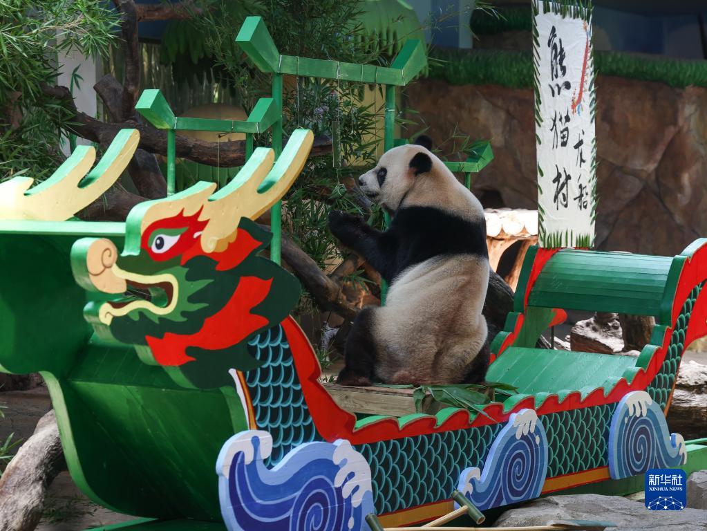 當日,廣州長(cháng)隆野生動(dòng)物世界熊貓館的10余只大熊貓迎來(lái)一個(gè)特別的端午節,它們與游客一起渡龍船、吃粽子,“體驗”一把端午文化的氛圍。