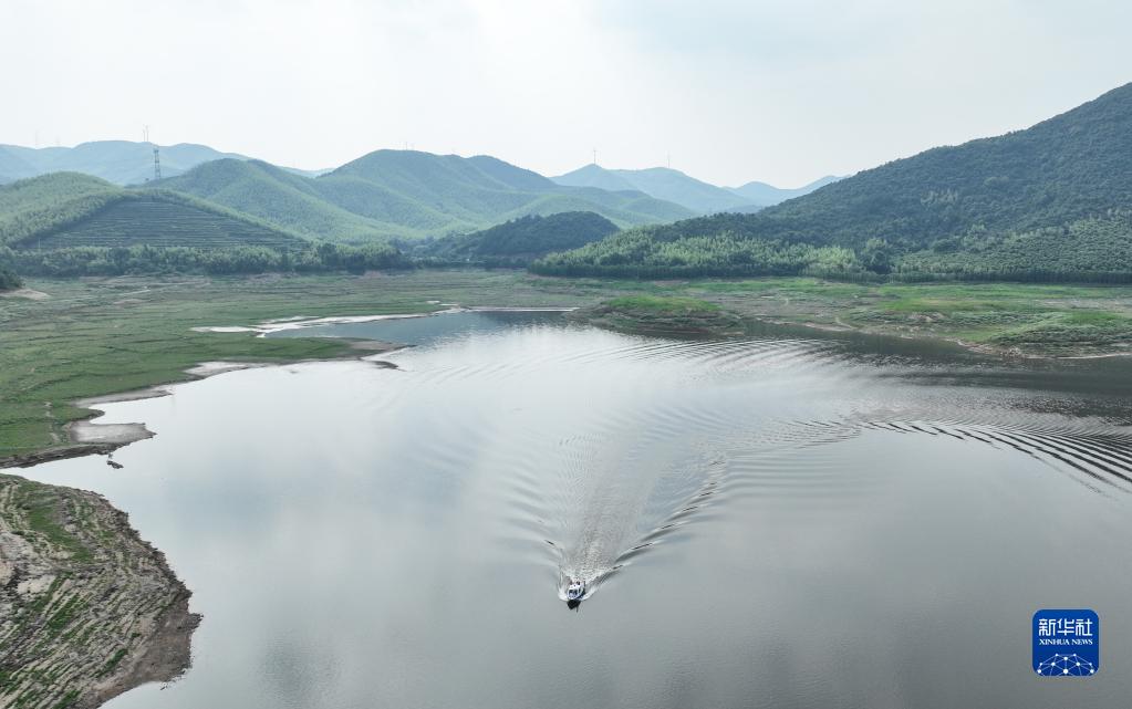 工作人員在埭溪鎮老虎潭水庫開(kāi)展聯(lián)合巡查,維護水源地安全(無(wú)人機照片,6月21日攝)。
