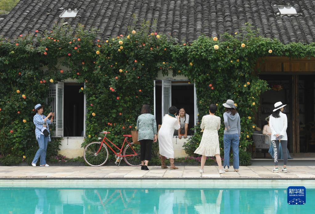 在埭溪鎮莫家柵村的玫瑰莊園,參觀(guān)者在玫瑰盛開(kāi)的花墻前留影(2023年4月20日攝)。