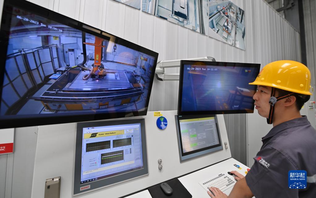 工作人員在天津中車(chē)唐車(chē)軌道車(chē)輛有限公司的車(chē)體車(chē)間內進(jìn)行作業(yè)(6月20日攝)。