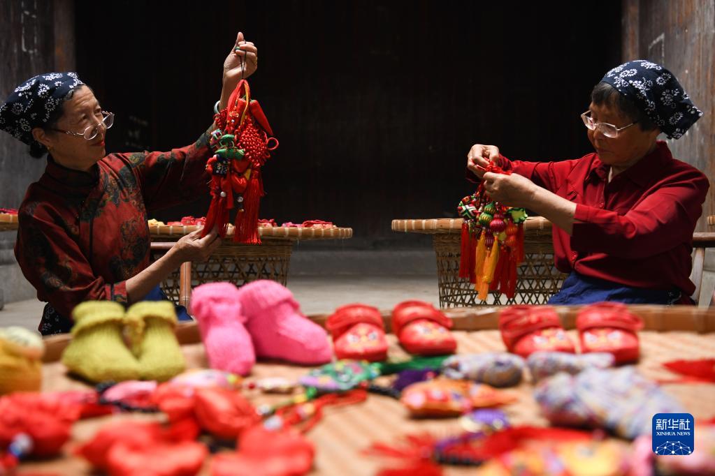 6月21日,歙縣許村村民吳木蘭(右)在整理她手工制作的香囊掛件。