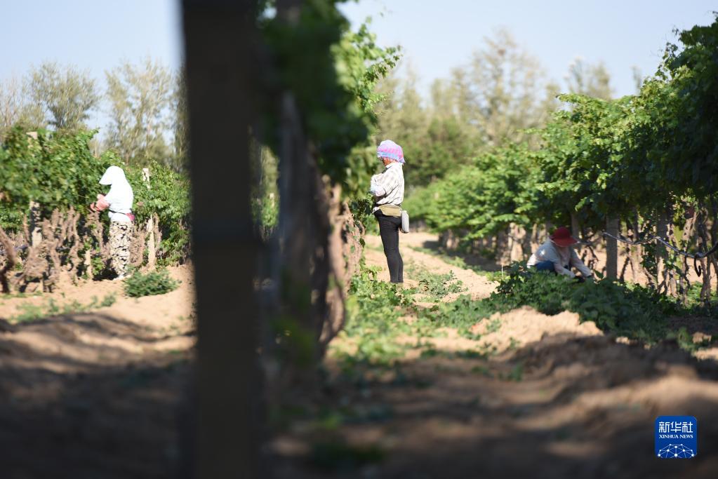 6月21日,在河北省懷來(lái)縣長(cháng)城桑干酒莊葡萄種植基地,當地農民在田間勞作。