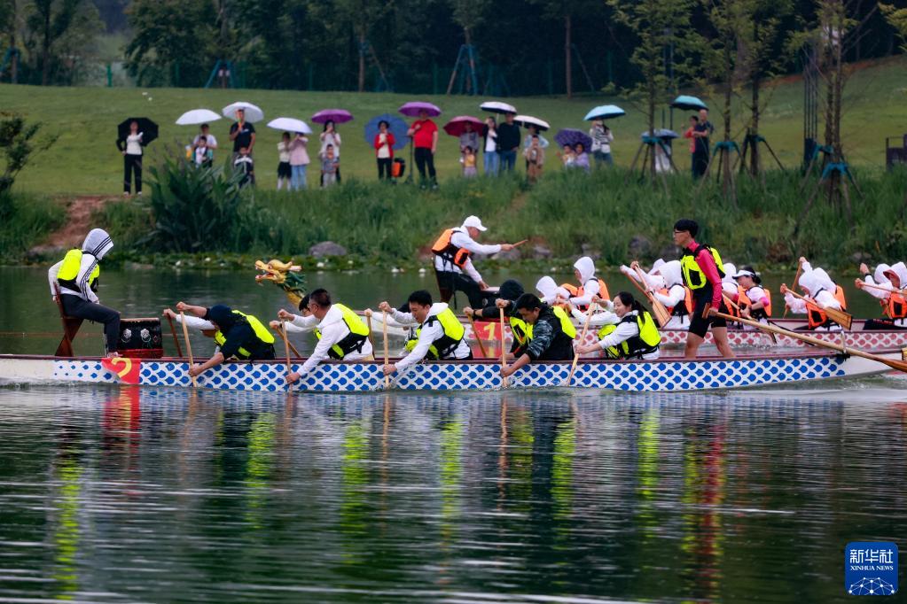 6月22日,市民在貴陽(yáng)市閱山湖濕地公園進(jìn)行劃龍舟比賽。