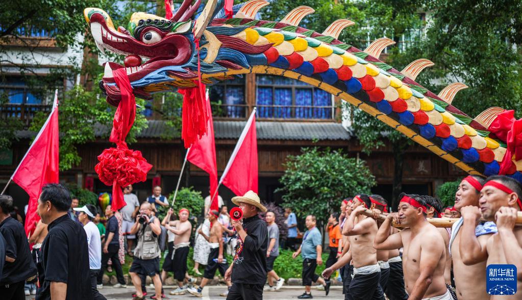 6月22日,在貴州省黔東南苗族侗族自治州施秉縣舉行的獨木龍舟節上,獨木龍舟進(jìn)行巡游。