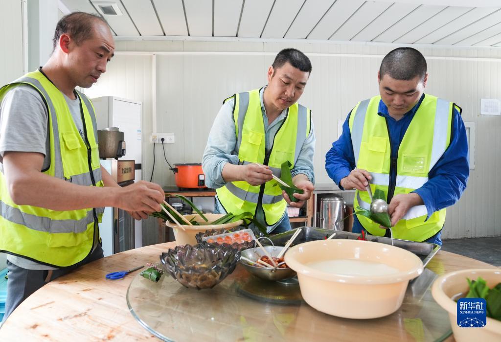 6月22日,中建三局一公司安裝公司工人在上海一處項目工地食堂包粽子。