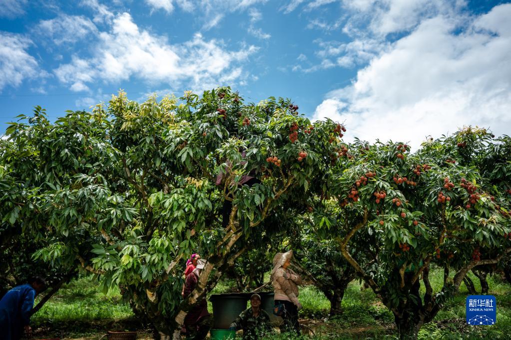 果農在云南省屏邊縣灣塘鄉米坡荔枝基地采摘荔枝(6月21日攝)。