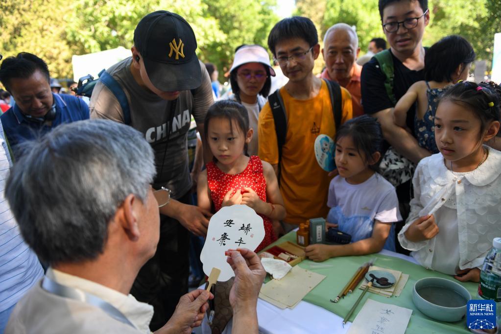 6月22日,一位書(shū)法家在北京龍潭湖公園為小朋友書(shū)寫(xiě)“端午安康”的扇面。