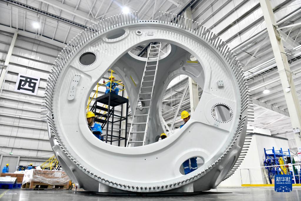 6月21日,在乳山市遠景能源零碳產(chǎn)業(yè)園,工作人員在風(fēng)機輪轂前作業(yè)。