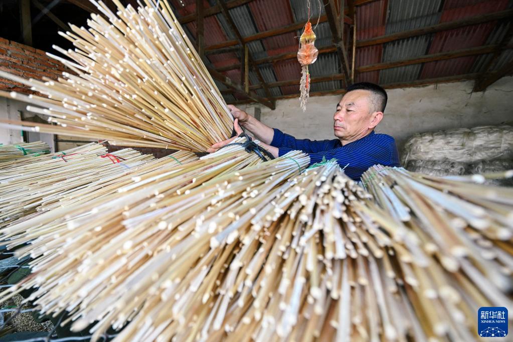 榮鳳明在庫房中整理工藝笤帚編制使用的原材料(6月21日攝)。