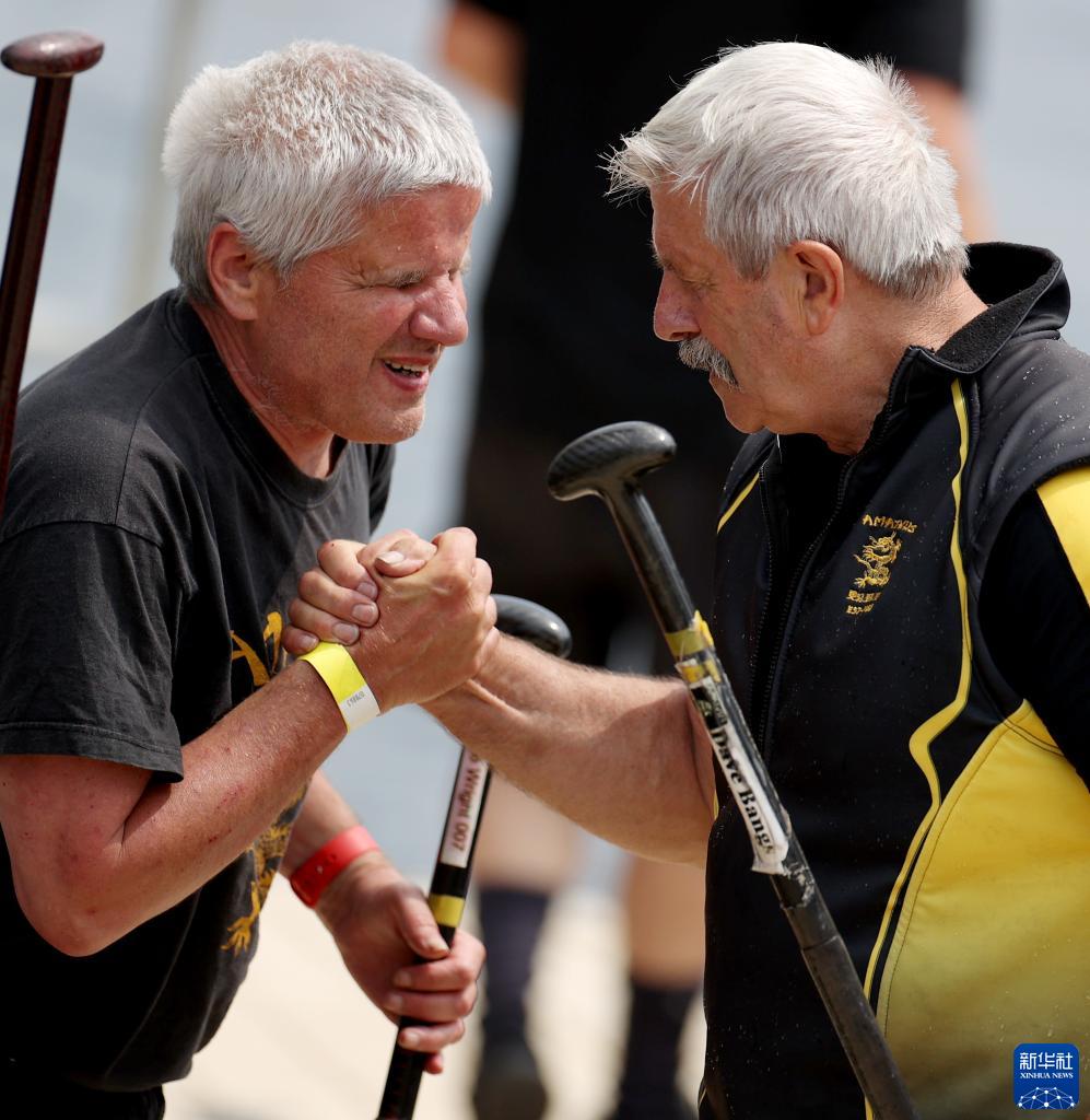 6月18日,在英國索爾福德市2023年全英中華端午龍舟會(huì )專(zhuān)業(yè)組比賽后,戴維·邦斯(右)感謝一位有視力障礙的團隊成員。