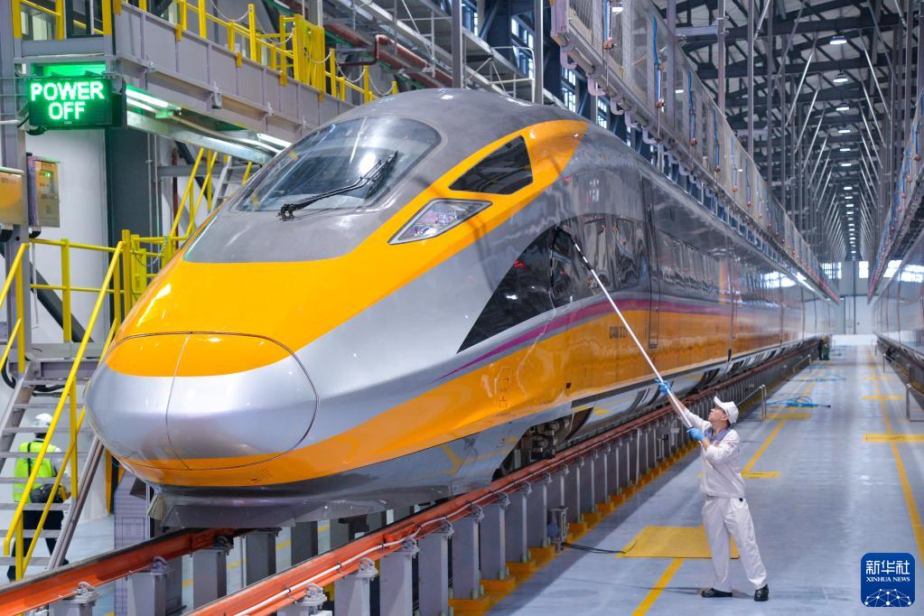 6月21日,在印度尼西亞萬(wàn)隆雅萬(wàn)高鐵德卡魯爾動(dòng)車(chē)所,工作人員擦拭清潔綜合檢測列車(chē)。