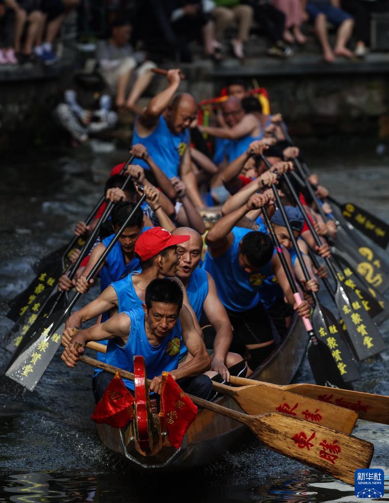 6月22日,“扒仔”(槳手)在佛山疊滘端午龍船漂移賽奮力揮槳,而舵手則穩坐在船頭船尾。