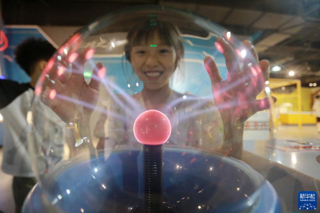 6月23日,小朋友在江蘇省揚州科技館內體驗“輝光球”。