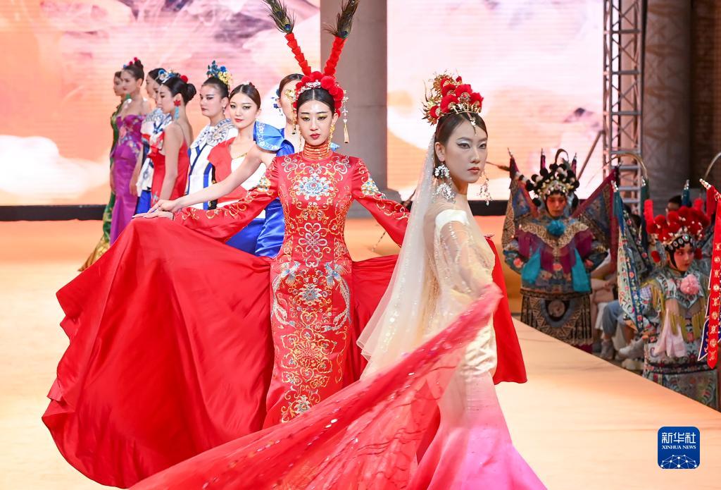 6月22日晚,在新疆國際大巴扎景區,模特在京劇《定軍山》演出同時(shí)展示時(shí)裝。