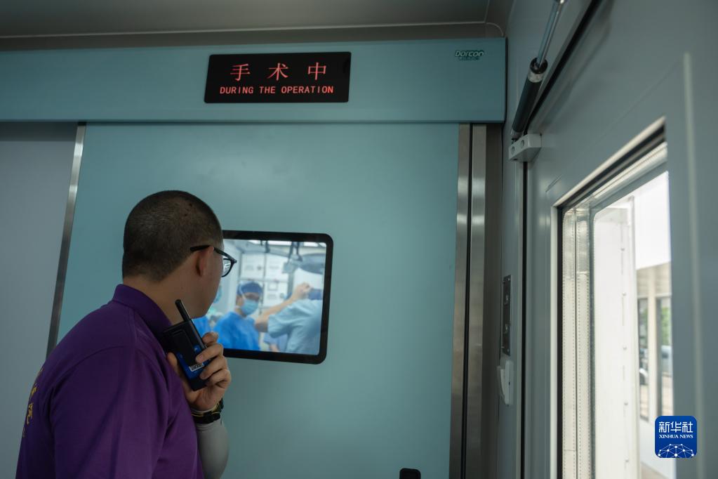 6月20日,在老撾首都萬(wàn)象瑪霍索醫院,中國醫生在移動(dòng)介入治療手術(shù)車(chē)上進(jìn)行治療。