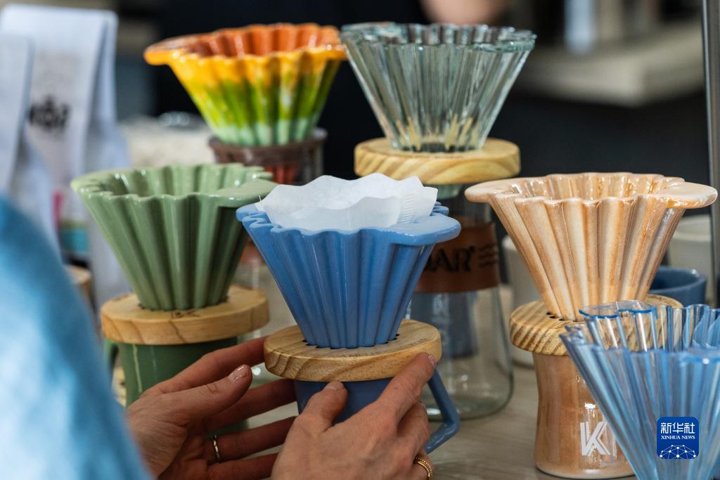 這是6月23日在巴西圣保羅舉行的咖啡節上拍攝的手沖咖啡濾杯。