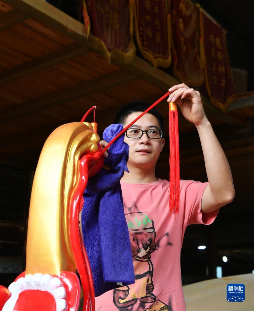 方紹晃的侄子方劍偉擦拭贈送馬祖鄉親的新龍舟龍頭(2023年5月31日攝)。