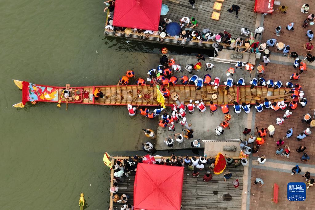 在福建省莆田市木蘭溪畔舉行的端午節龍舟傳統祭江儀式現場(chǎng),一艘龍舟準備下水(2023年6月13日攝,無(wú)人機照片)。