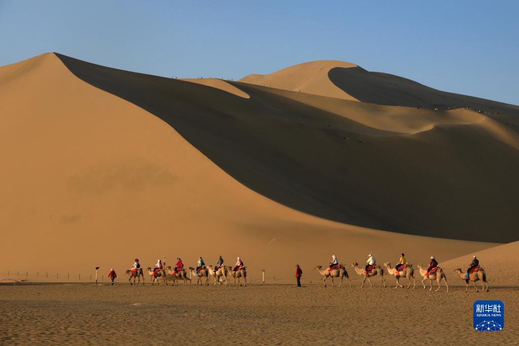 6月24日,游客在甘肅省敦煌市鳴沙山月牙泉景區游覽。